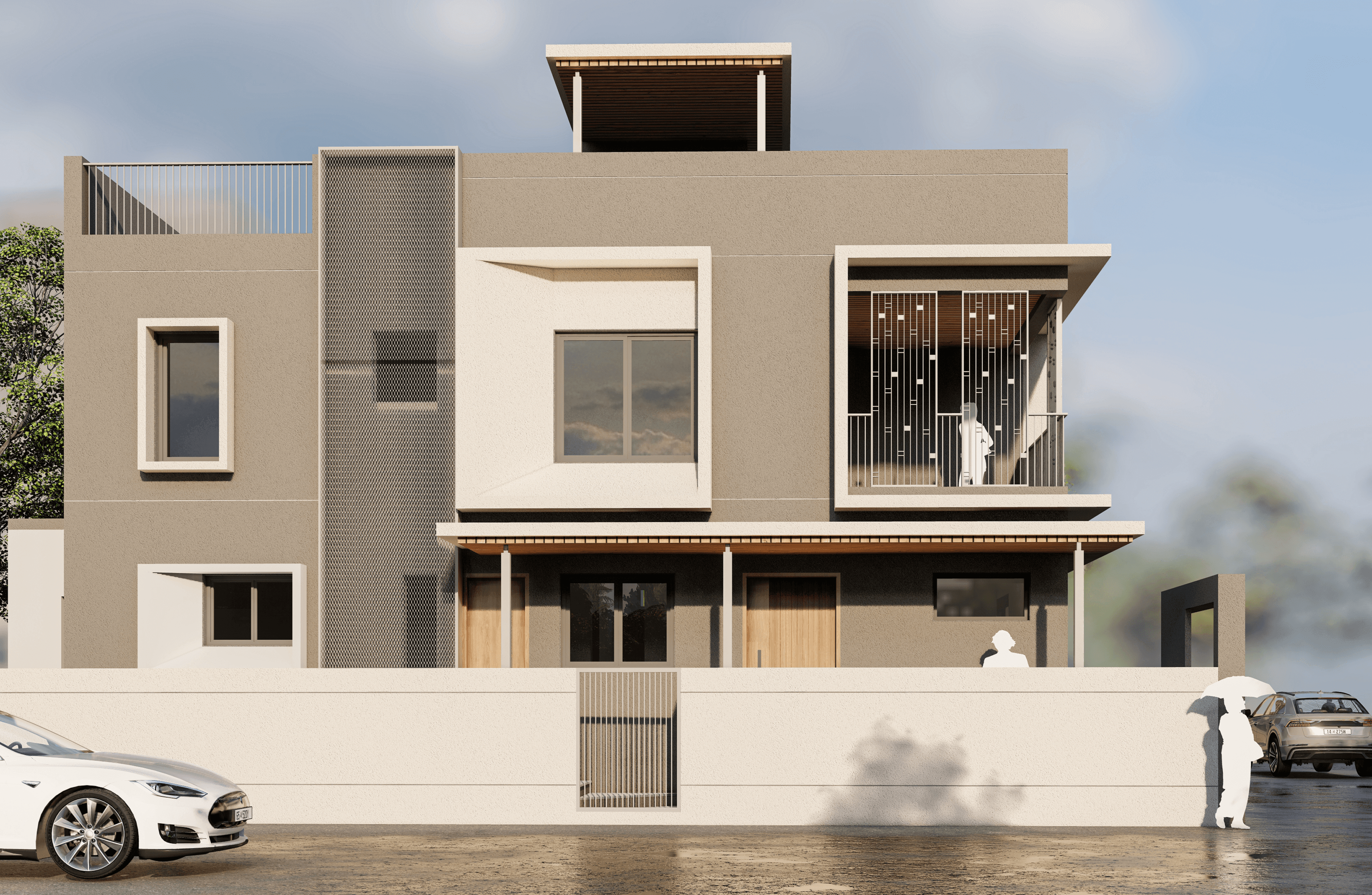 The design employs a "stacked" approach, where each floor features distinct setbacks and overhangs, creating a sense of depth and architectural rhythm.